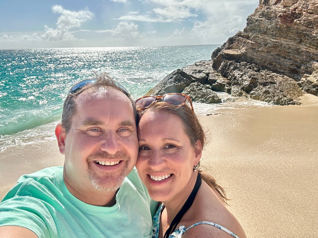 We decided to backtrack and find Mullet Bay (recommendation from Ronnie, rental car guy) which we assumed we had passed on the way to Maho Bay. We saw where several cars were parked across the street from an area with a lot of trees and took a chance and parked and walked across the street. The most beautiful beach emerged. There were palm trees…BEAUTIFUL sand…and the MOST gorgeous water that had amazing shades of blue and green. At the end of the beach was a rock formation.
