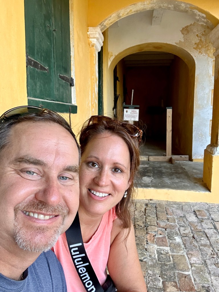 We went to a large souvenir shop, walked the boardwalk, admired all the sailboats in the harbor, and the beautiful blue and green water. We walked a couple blocks to Fort Christiansted and met a local couple who took our picture and then recommended going through the fort and then buying a local St Croix bracelet from the original design jewelry shop, Sonya’s.
