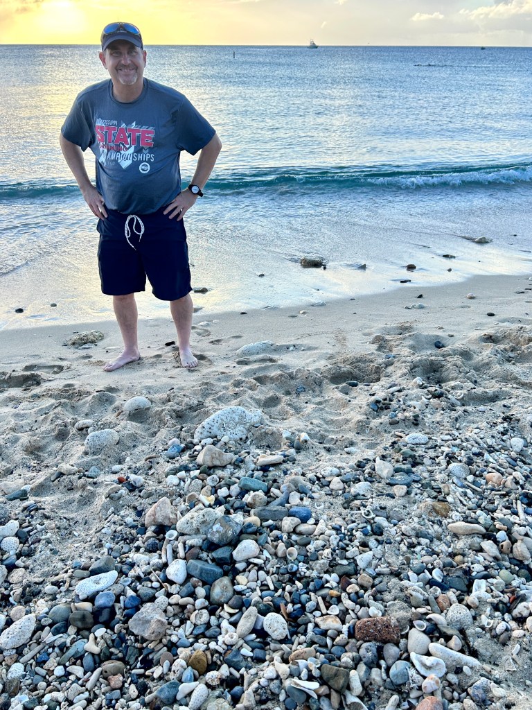 When we got back to Frederickstad, we walked over to Paradise Beach and sat on the sand and admired the beautiful sunset and the ship at the dock. We couldn’t believe the shells, rocks and sea glass. It was unbelievable. The beach wasn’t that pretty, the sand was coarse, and dark, but the water was beautiful and the shells were unreal.
