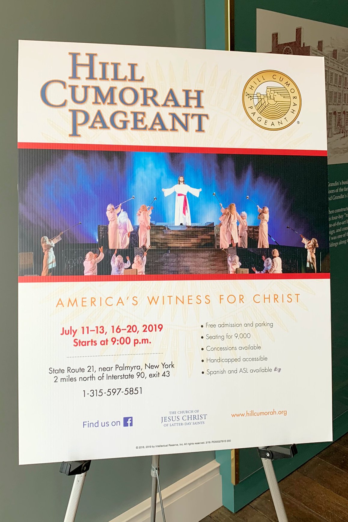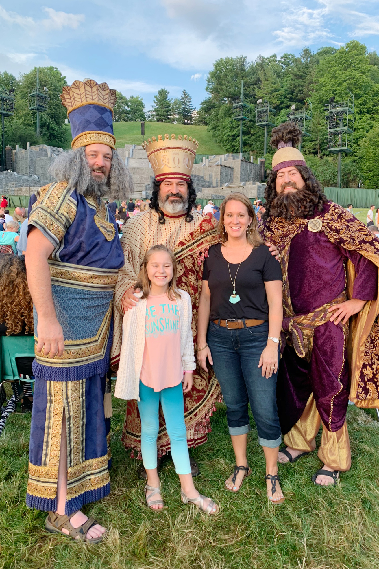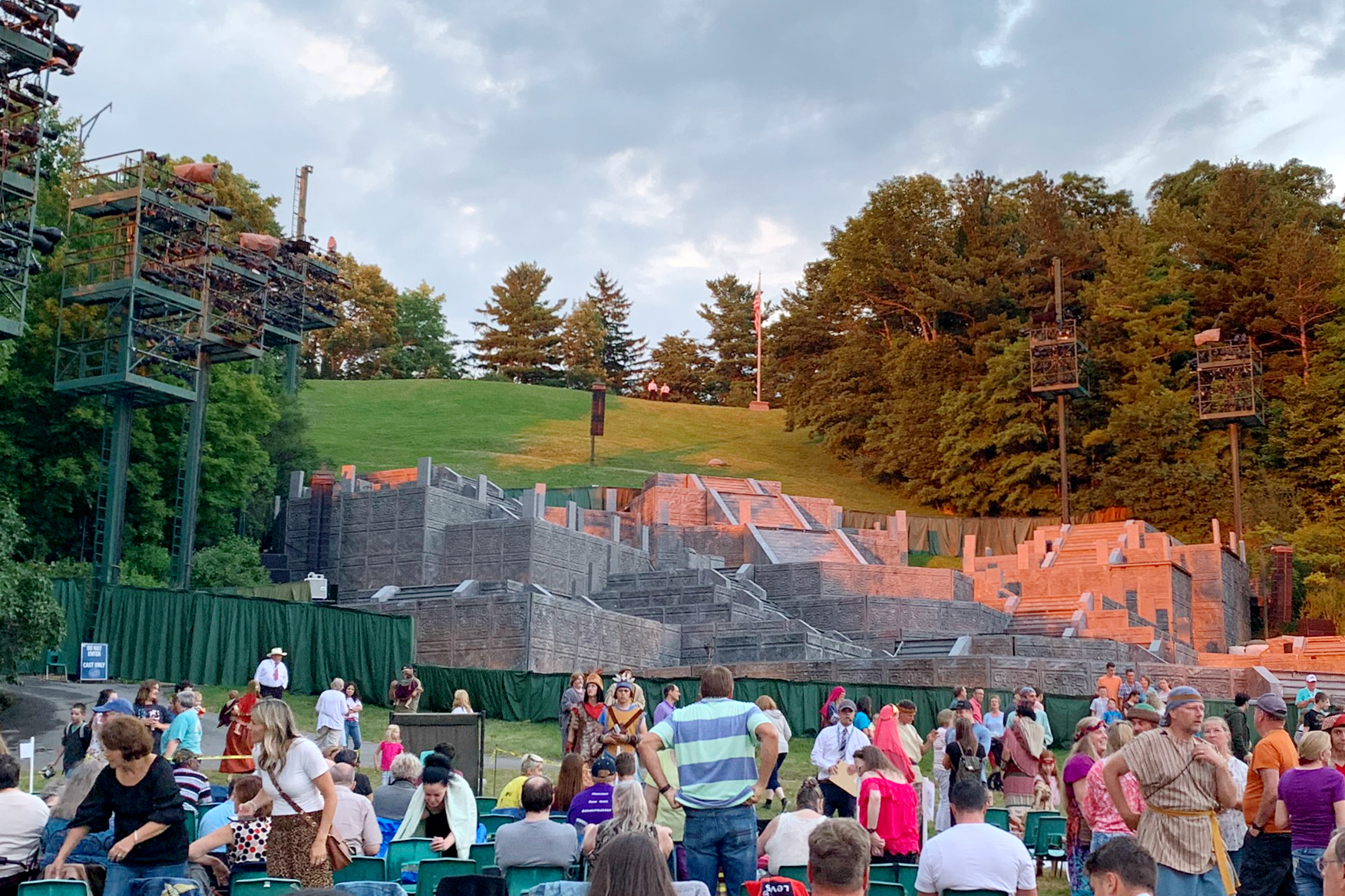 The Hill Cumorah Pageant began in 1937 and grew to more than 700 cast members, 1,300 costumes, a 10-level stage, and attracted approximately 35,000 viewers annually. The pageant was performed for the last time in 2019 and we were fortunate to be able to be there for one of the final performances. Because seating for the pageant is first-come, first-serve, when we first arrived in Palmyra we found the spot we where we wanted to sit and placed some of our belongings on a few of the chairs and then visited the other church historical sites throughout Palmyra. The pageant didn’t begin until it was dark around 9 pm and when we came back to our seats around 7 pm everything was as we had left it. We visited with the people sitting around us, met and took pictures with the performers and bought popcorn and drinks for the show.