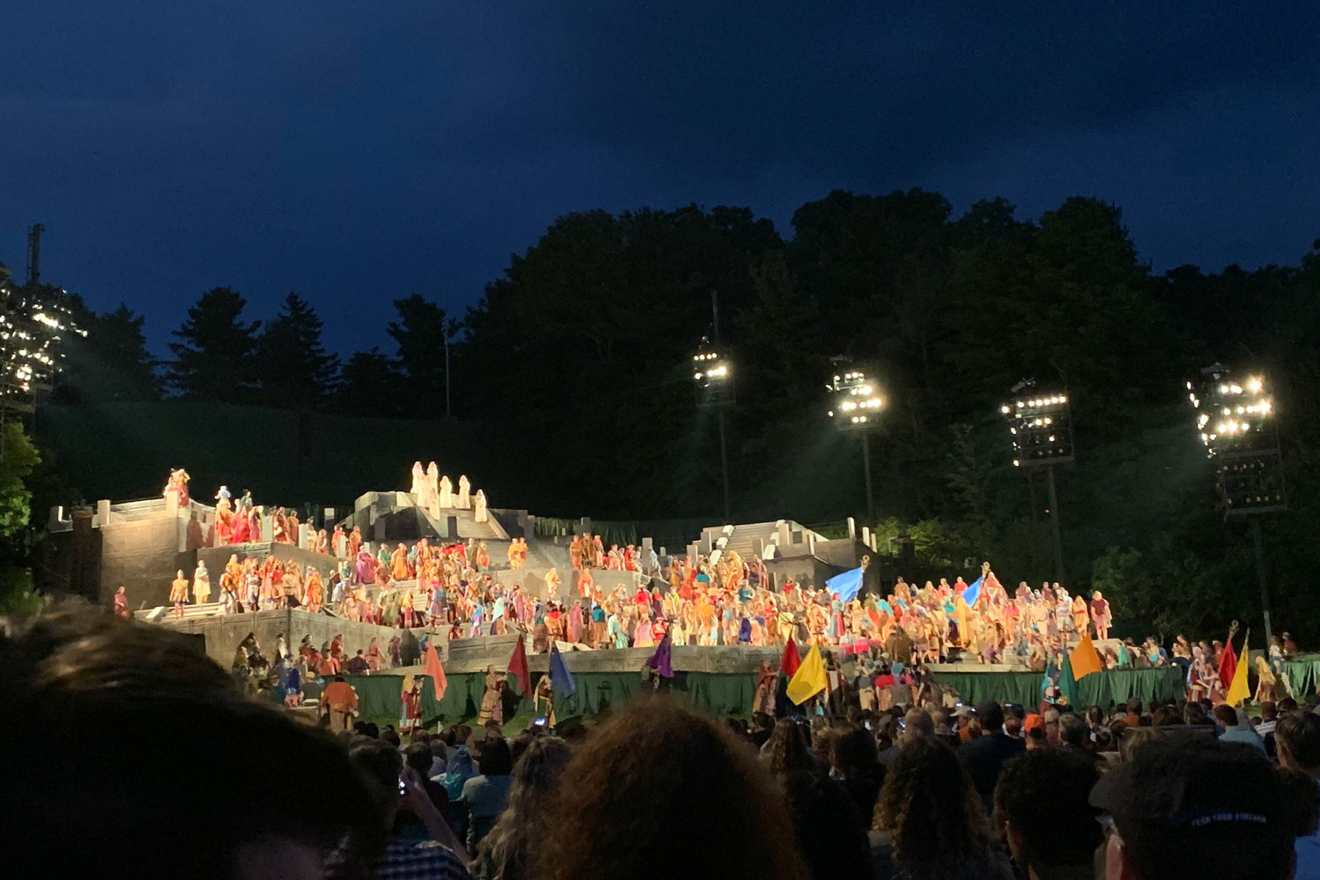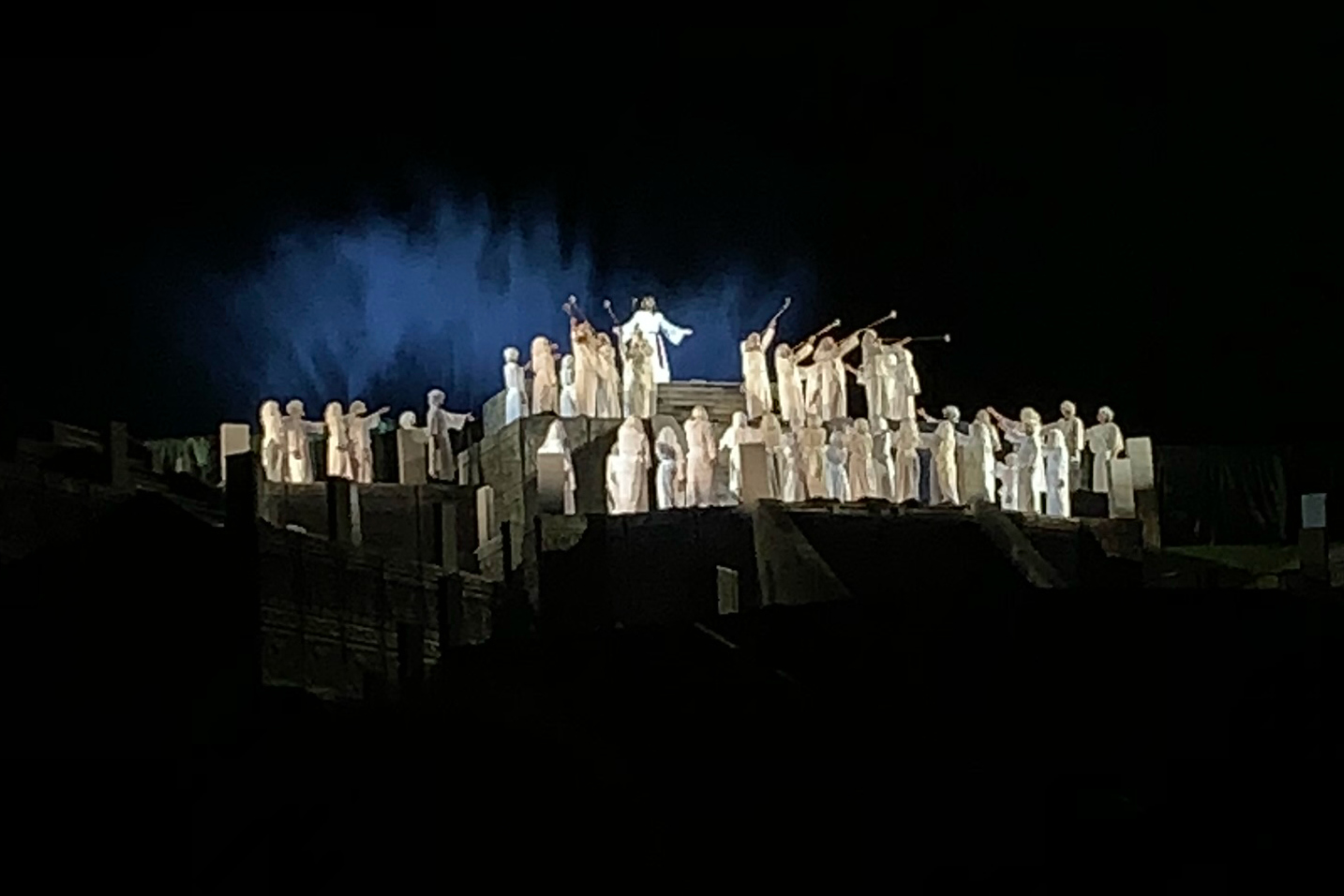 The set, costumes, special effects, script, and acting were all incredible. The depiction of the Savior’s appearance to the Nephites was breathtaking. He descended from the top of Hill Cumorah lit with a spotlight, dressed in white so that it appeared that he was glowing. His love for the Nephite people and their children was so tender. It was a wonderful portrayal and the Spirit throughout was so strong. There was a beautiful sunset before the show started and a beautiful moon throughout the performance. It was as if all nature was in agreement of the sacredness of the special performance.