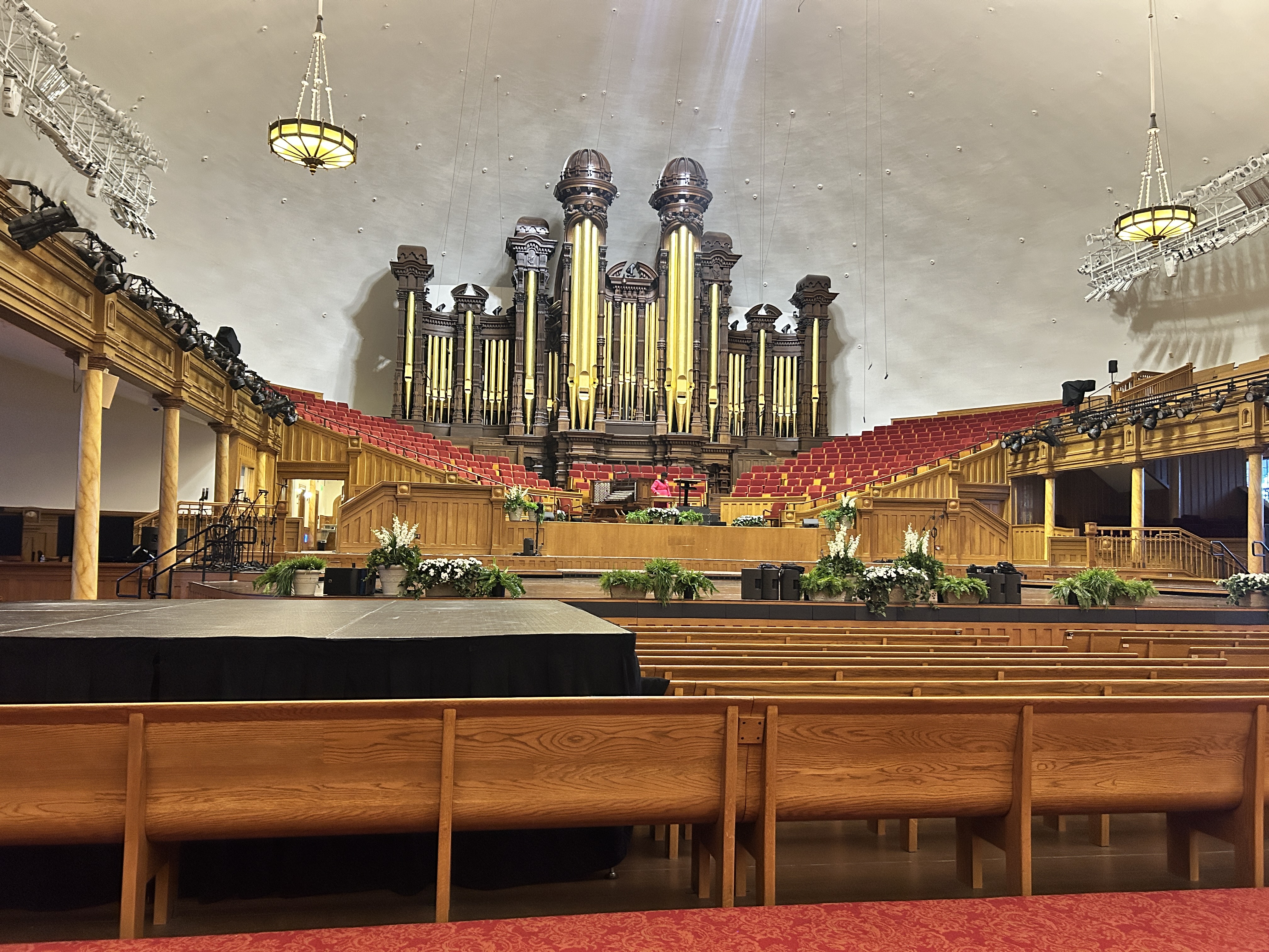 Assembly Hall. A Gothic Revival building finished in 1882, using stone from the same quarry as the Salt Lake Temple. The Assembly Hall was a beautifully decorated gathering place for congregations and community events. There are murals on the ceiling depicting scenes from the history of the Church. The woodwork is painted to resemble marble.